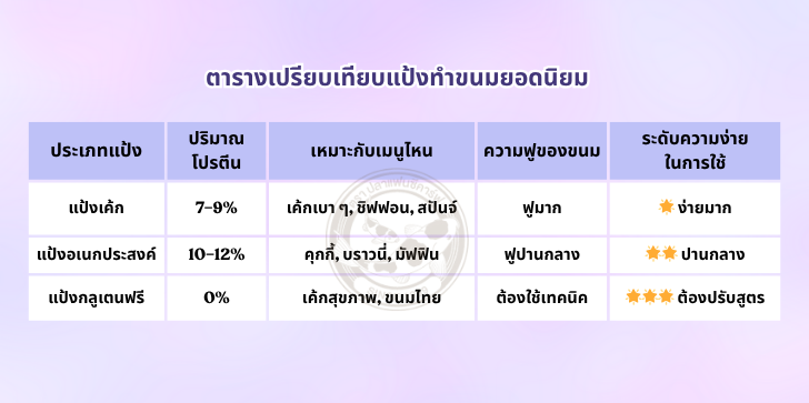 แป้งแต่ละชนิดมีคุณสมบัติเฉพาะตัว โดยเฉพาะ “ปริมาณโปรตีน” ซึ่งเป็นตัวกำหนดว่าขนมจะออกมา เบา–นุ่ม หรือ แน่น–แบน อย่างไม่น่าให้อภัย!
