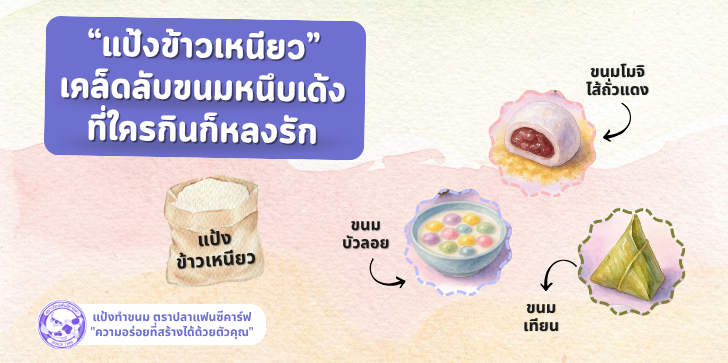 แป้งข้าวเหนียวเป็นวัตถุดิบสำคัญที่ไม่ควรมองข้าม เพราะมีผลอย่างมากต่อเนื้อสัมผัสของขนม ถ้าเลือกให้ถูกและใช้อย่างเข้าใจ ไม่ว่าจะเป็นขนมไทยโบราณ หรือขนมญี่ปุ่นร่วมสมัย ขนมของคุณก็จะออกมาน่ารัก อร่อย และถูกใจทุกคนแน่นอน