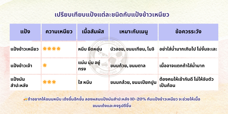 เมื่อเทียบกับแป้งข้าวเจ้า ซึ่งให้เนื้อแน่นและอยู่ทรง แป้งข้าวเหนียวจะให้เนื้อสัมผัสที่ หนึบหนับ เคี้ยวเพลิน และเหมาะกับเมนูอย่างบัวลอย ขนมเทียน หรือโมจิเป็นพิเศษ