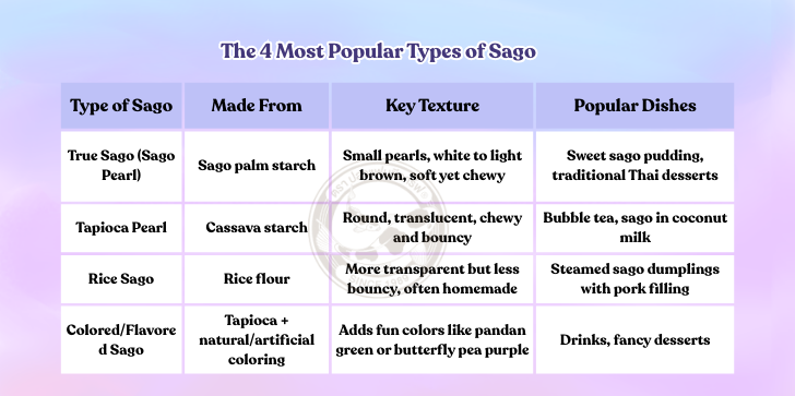 When you hear the word “sago,” you probably picture those tiny, chewy pearls floating in coconut milk or at the bottom of a bubble tea, right? But did you know there’s more than just one type of sago? Each variety brings a unique charm to Thai desserts and even baked goods 🍃